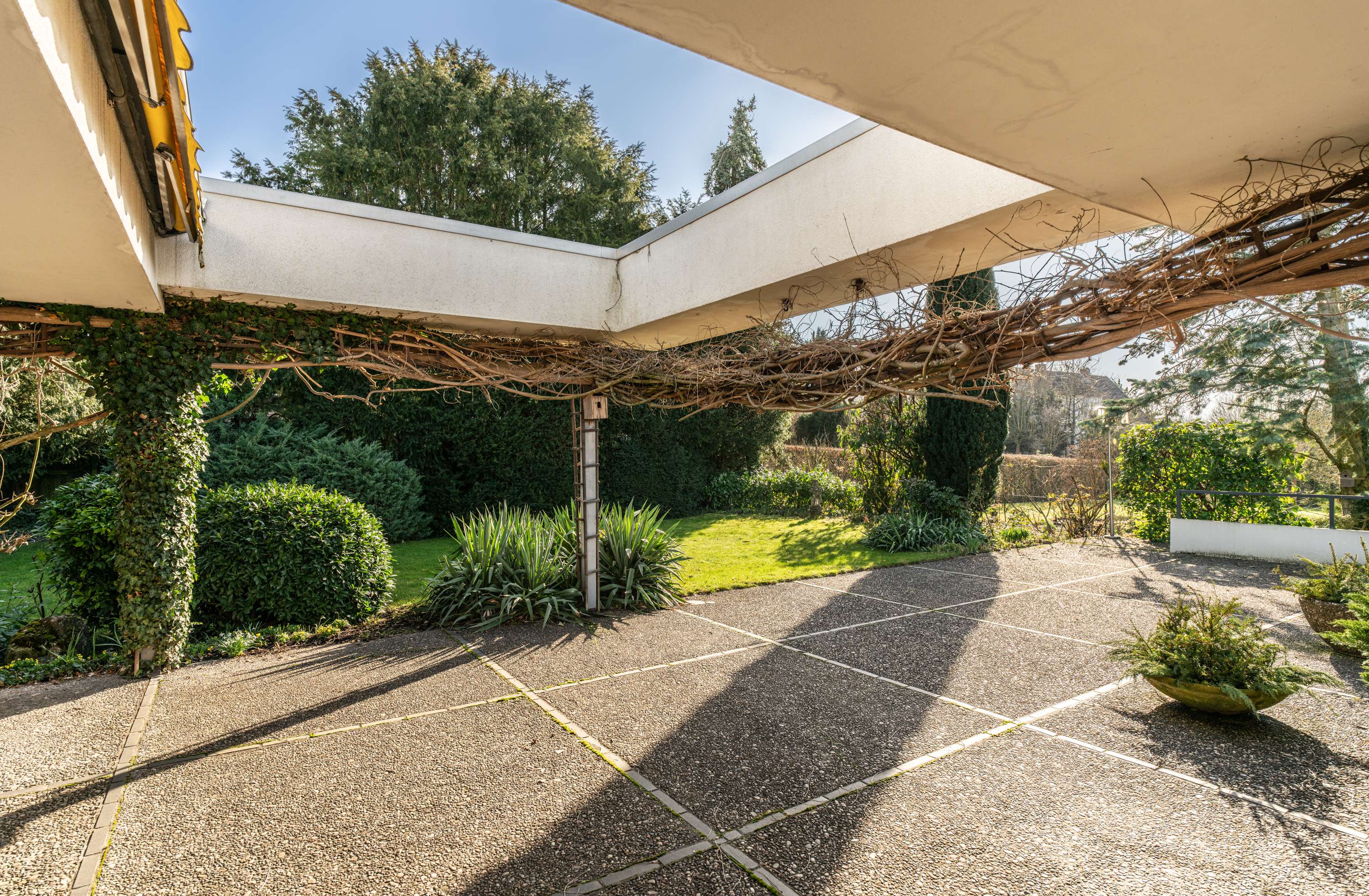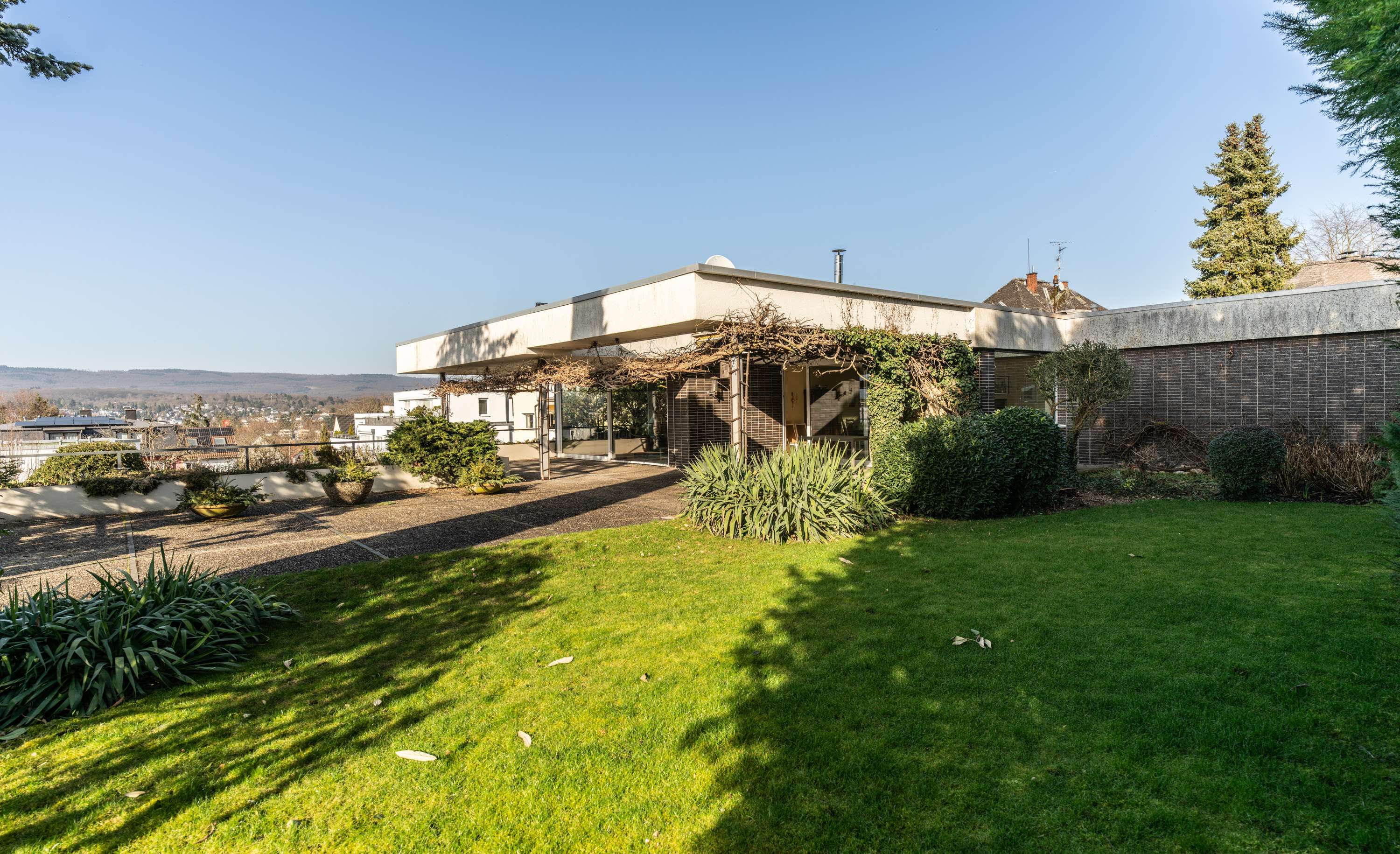 In einer äußerst ruhigen Wohnstraße befindet sich dieses außergewöhnliche Anwesen auf einem großzügigen ca. 1.276,00 m² großen Grundstück. Die Immobilie überzeugt durch ihre klare, architektonisch anspruchsvolle Bauweise, weitläufige Terrassenflächen und einen herrlich eingewachsenen Garten. Große Fensterfronten schaffen lichtdurchflutete Räume und verbinden den Innenbereich harmonisch mit den großzügigen Außenflächen.