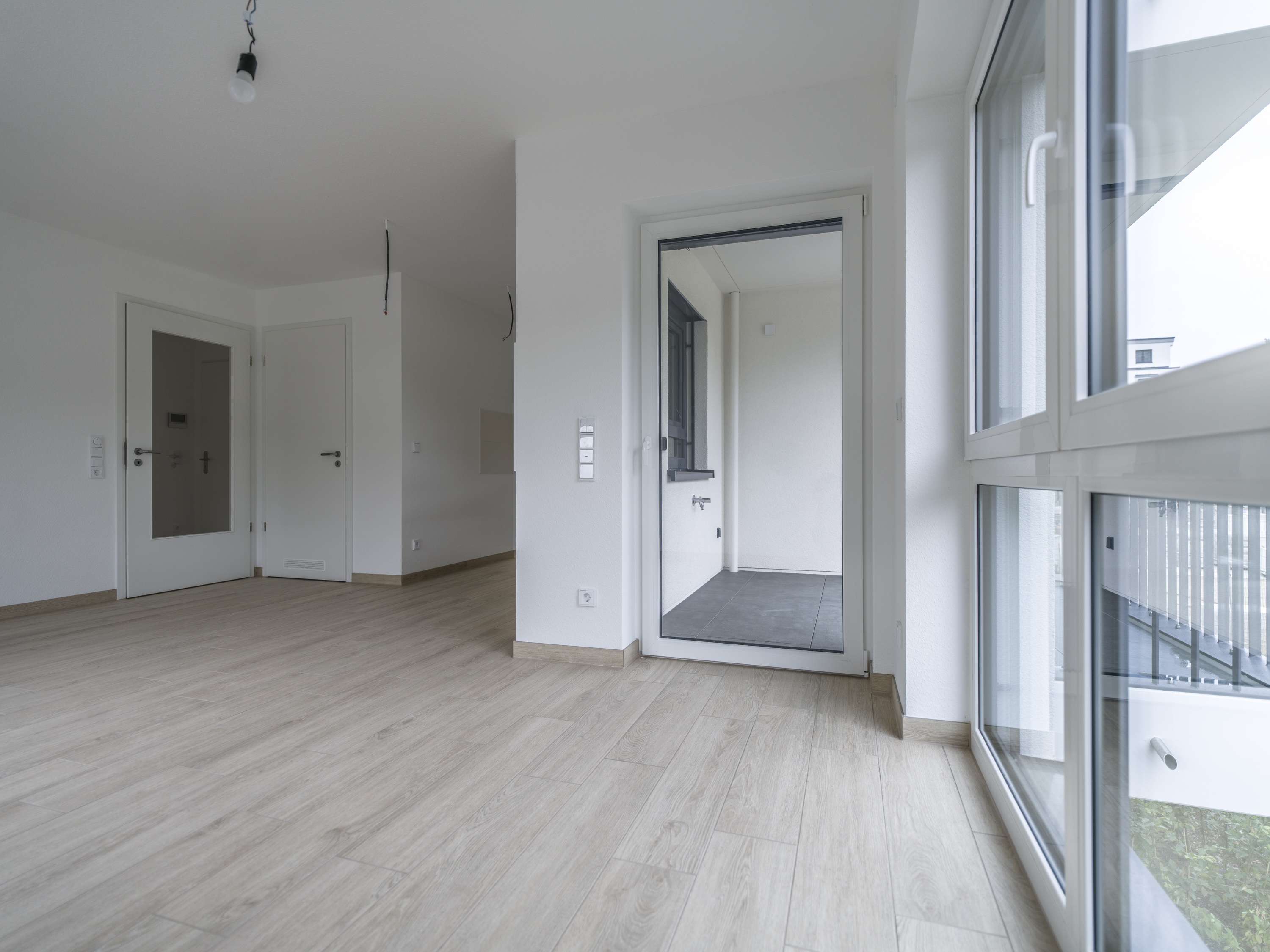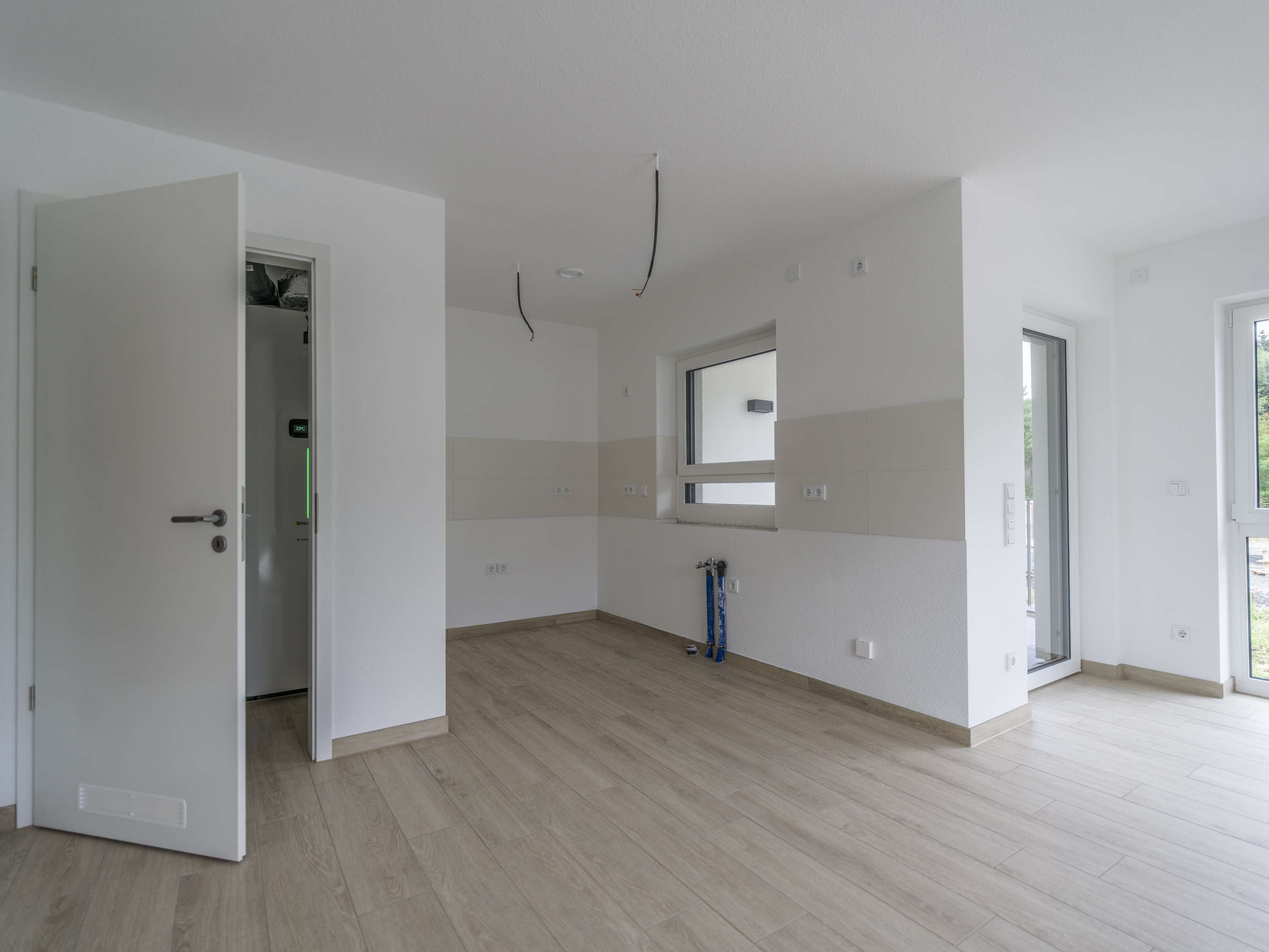 Durch die großen Fensterelemente wirkt die Wohnung hell und freundlich. Der geräumige Wohn- und Essbereich ist mit einer anliegenden und neuen Einbau-Küche versehen und bietet zudem die Möglichkeit auf der Terrasse zu verweilen.