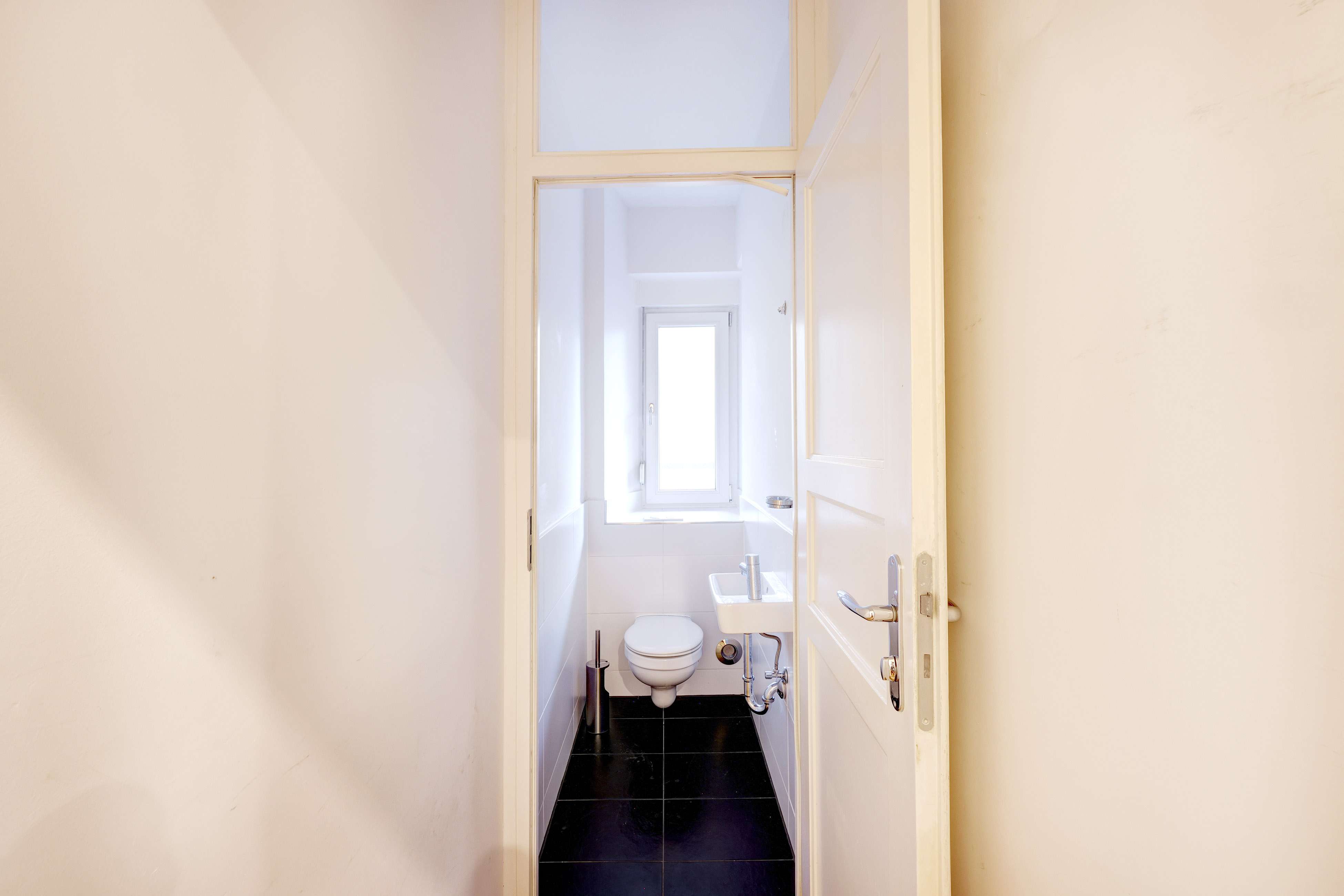 Die Wohnung befindet sich im ersten Stock und besticht durch ihren einzigartigen Charakter, der durch sorgfältig restaurierte Altbauelemente und die 2,80 m hohen Decken betont wird.