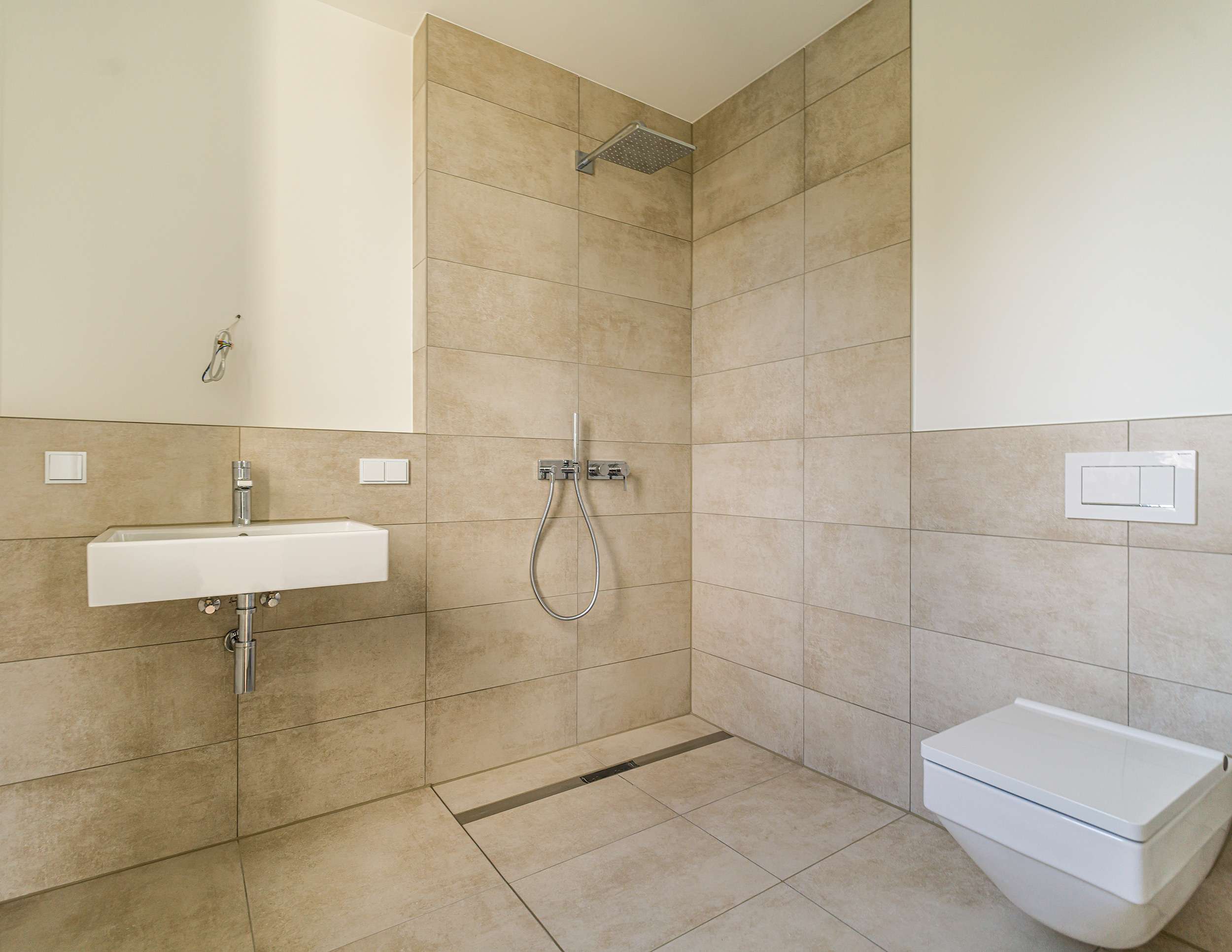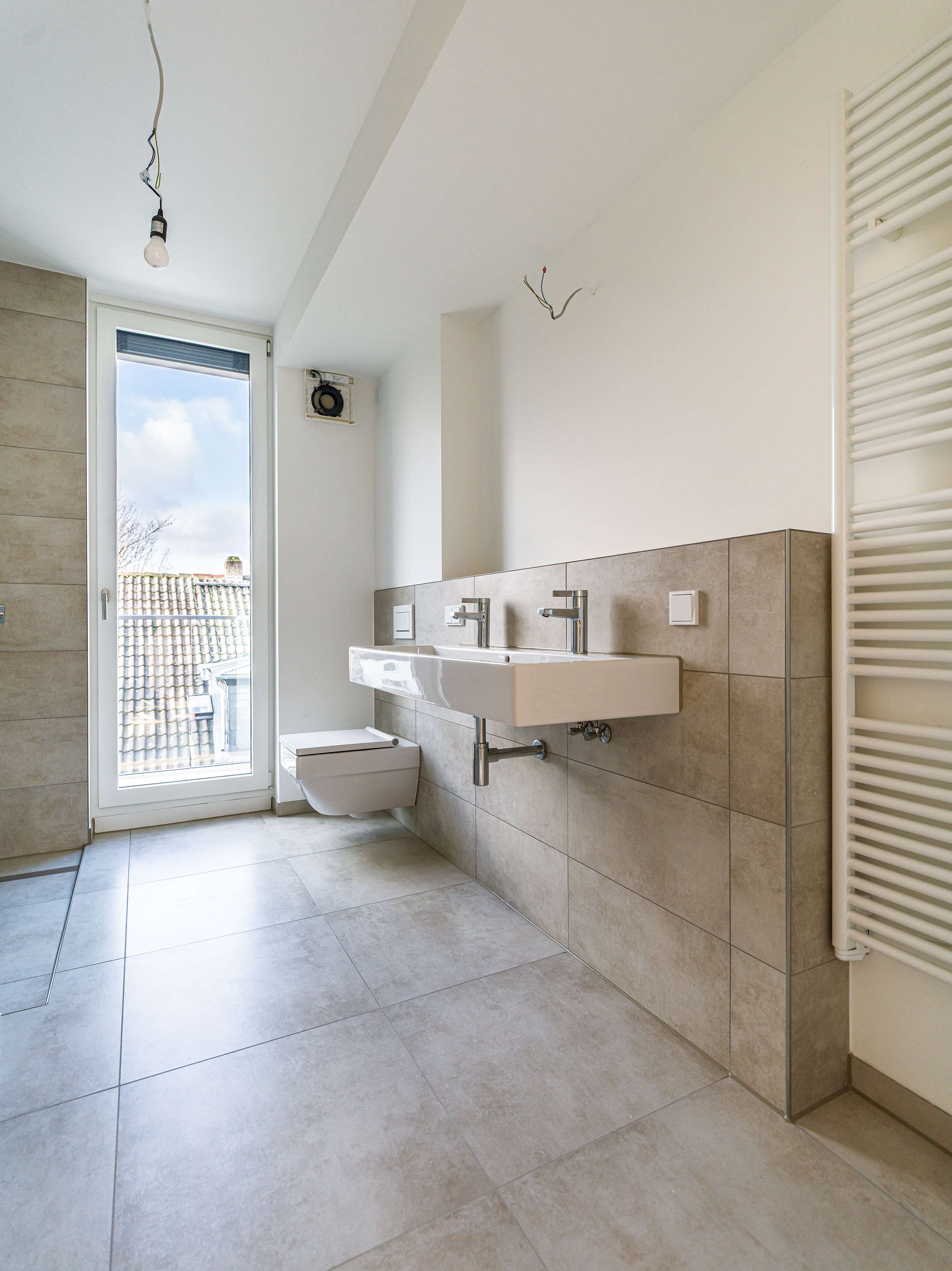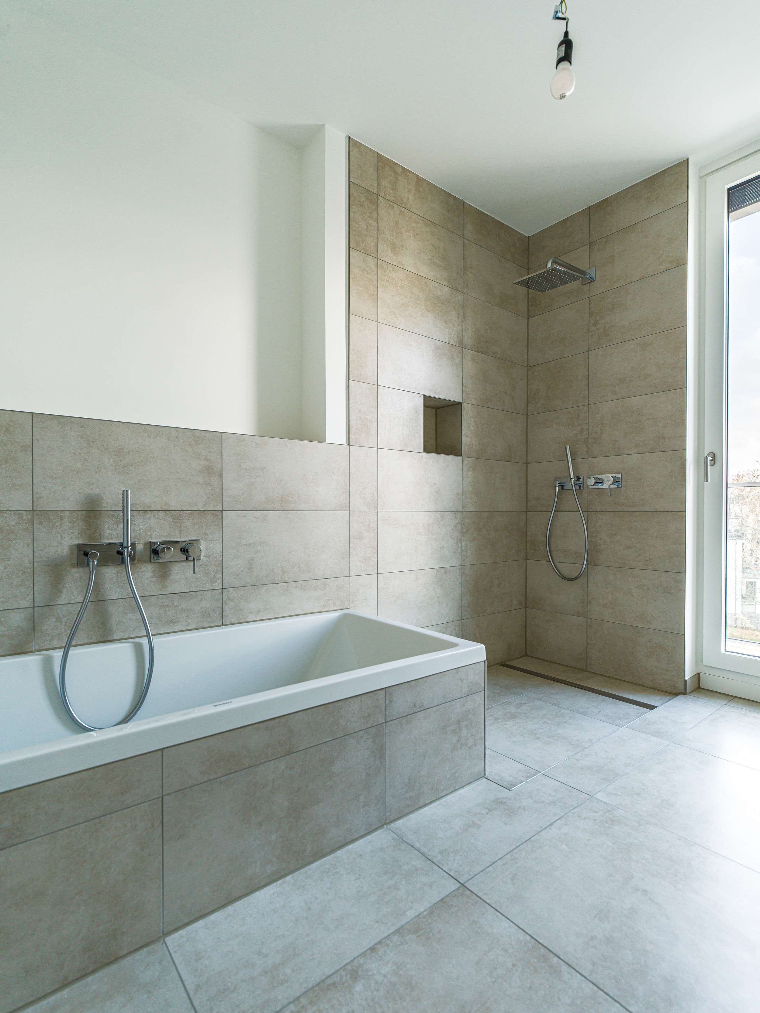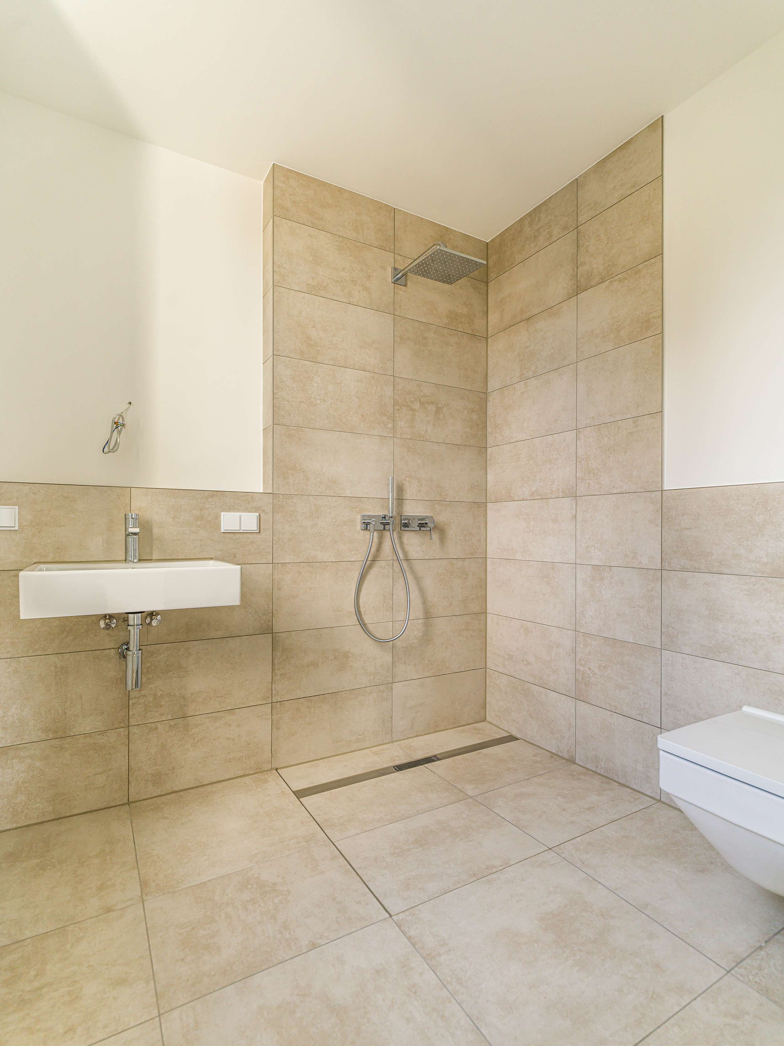 Die Tageslichtbäder werden jeweils mit großformatigen, hellen Feinsteinzeugfliesen versehen. Das Duschbad verfügt über eine bodengleiche Dusche mit Glasabtrennung, das Bad über eine Einbauwanne und einem Doppelwaschtisch. Zudem verfügt die Wohnung über ein Gäste-WC.