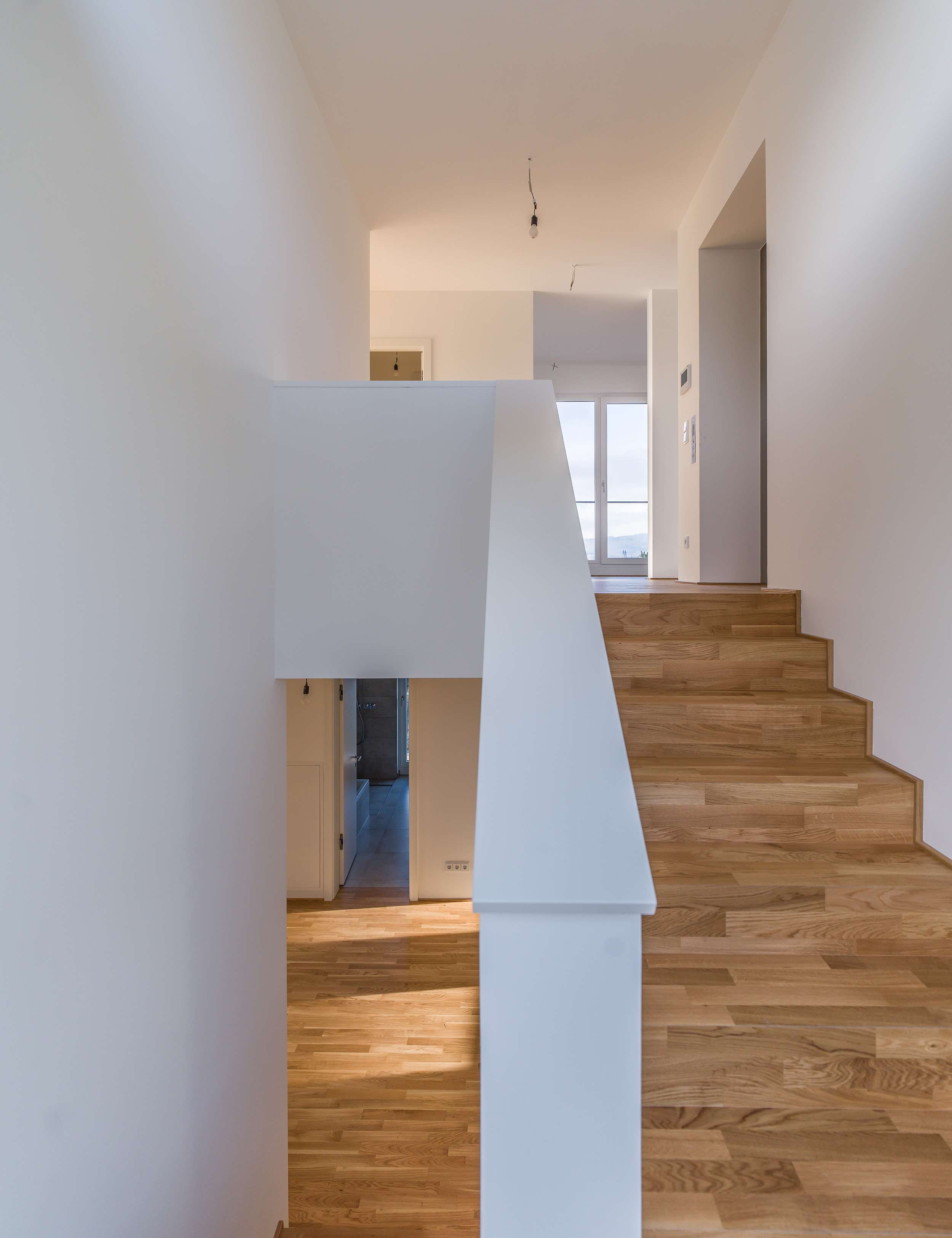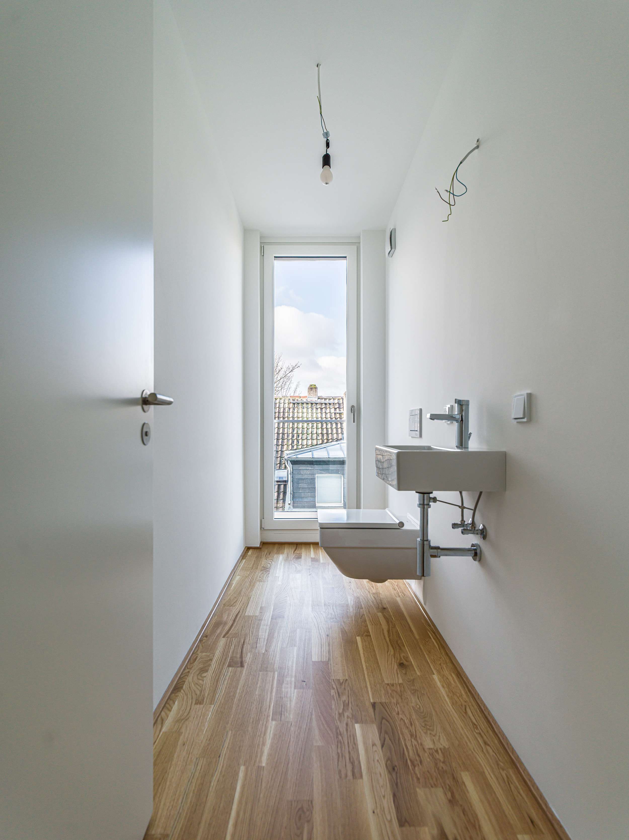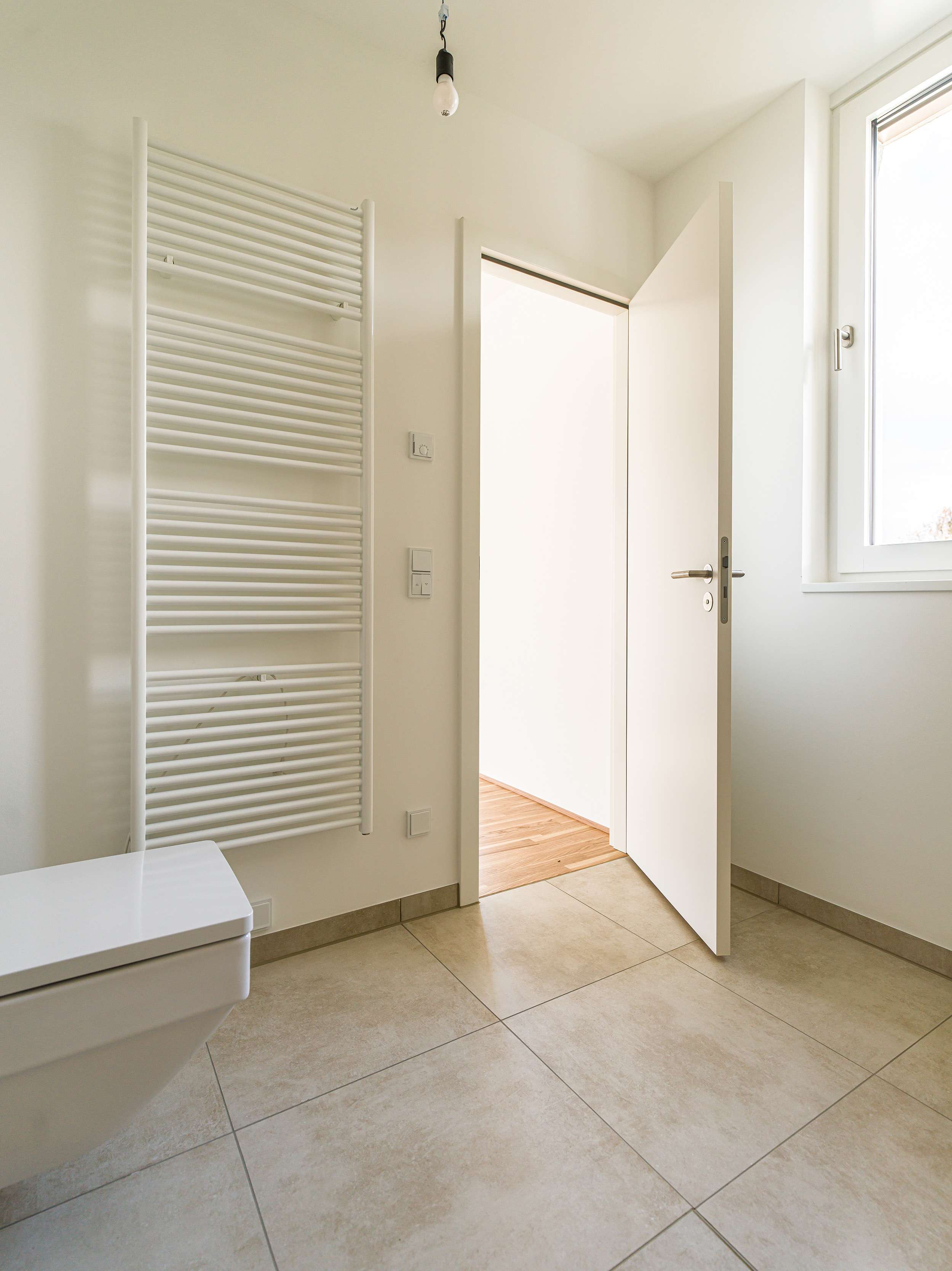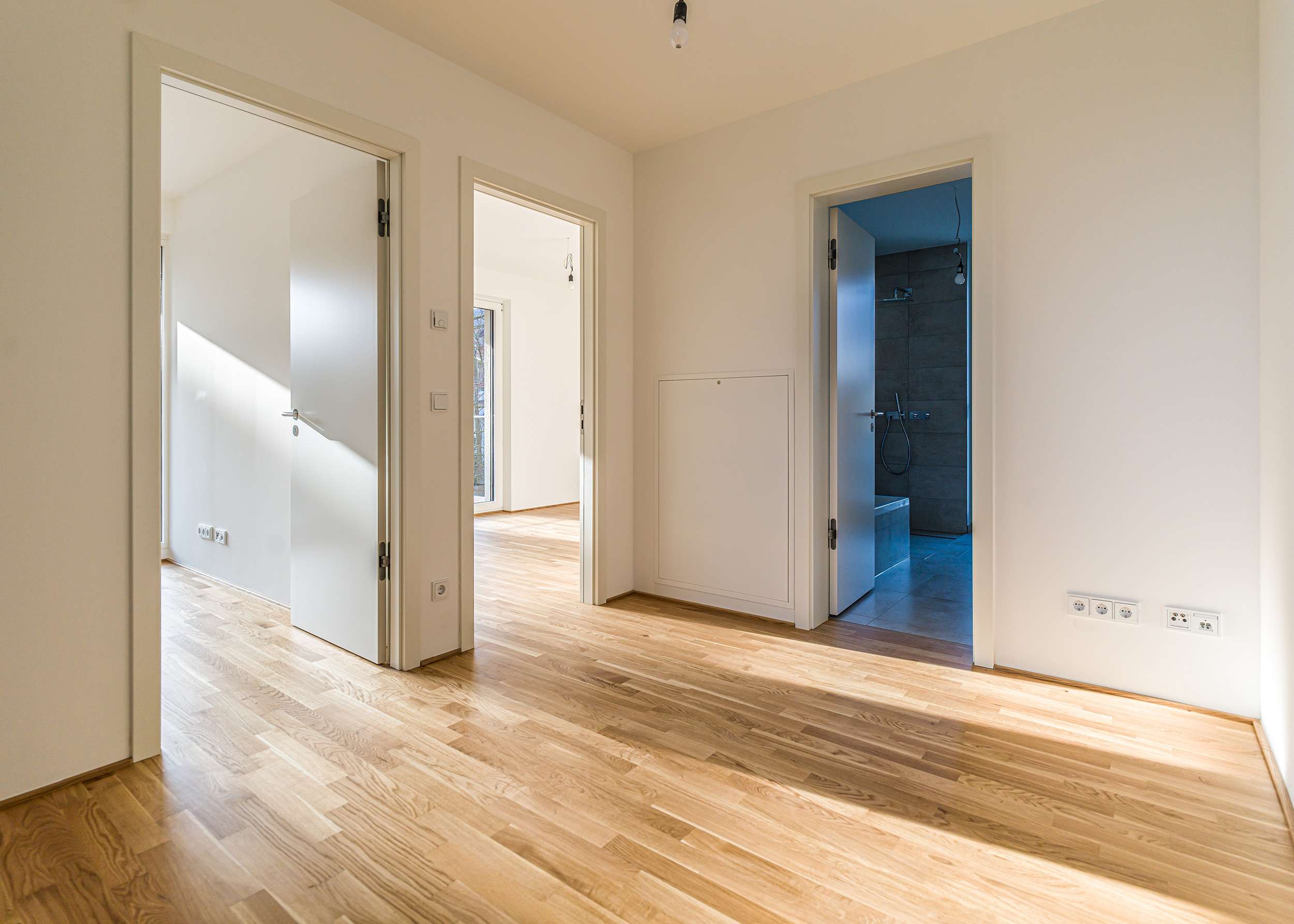 Die Tageslichtbäder werden jeweils mit großformatigen, hellen Feinsteinzeugfliesen versehen. Das Duschbad verfügt über eine bodengleiche Dusche mit Glasabtrennung, das Bad über eine Einbauwanne und einem Doppelwaschtisch. Zudem verfügt die Wohnung über ein Gäste-WC.