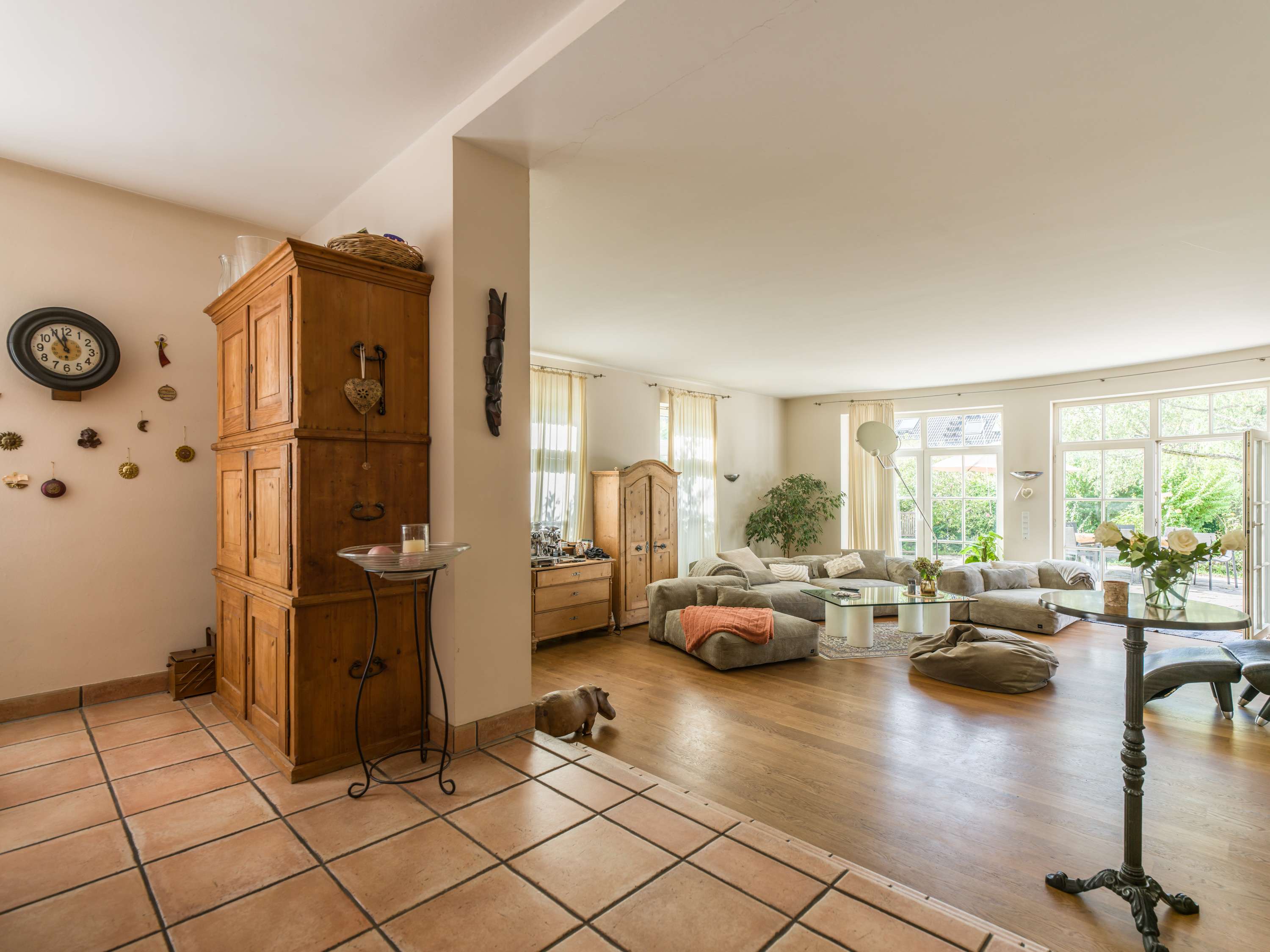 Der großzügige Eingangsbereich mit Gästebad und separatem Arbeitszimmer führt in einen offenen, lichtdurchfluteten 80 m² großen Wohn- und Essbereich mit integrierter Küche. Bodentiefe Fenster öffnen sich zu einer großen, sonnigen Natursteinterrasse (ca. 60 m²).