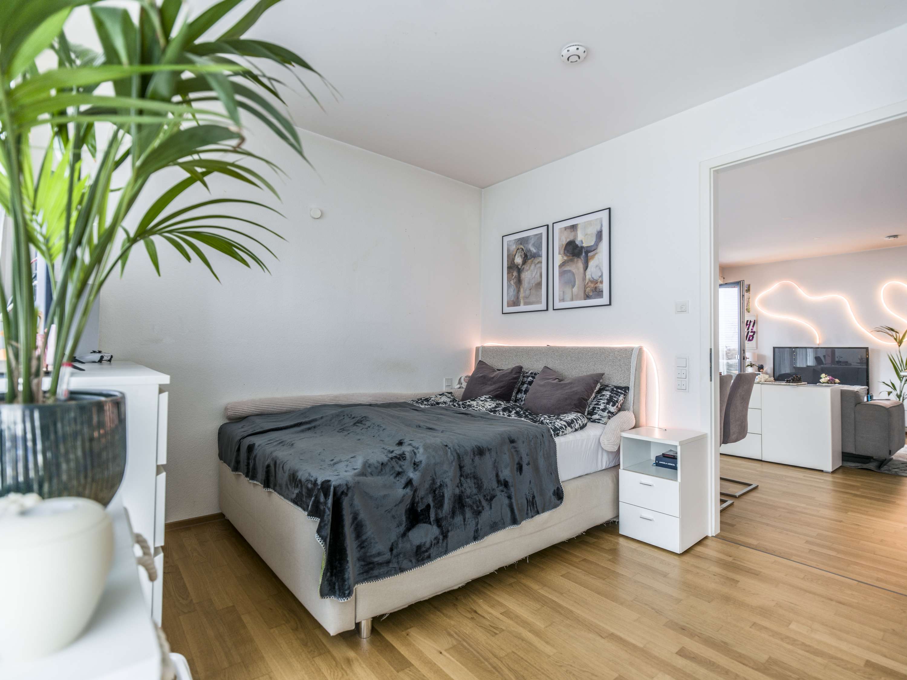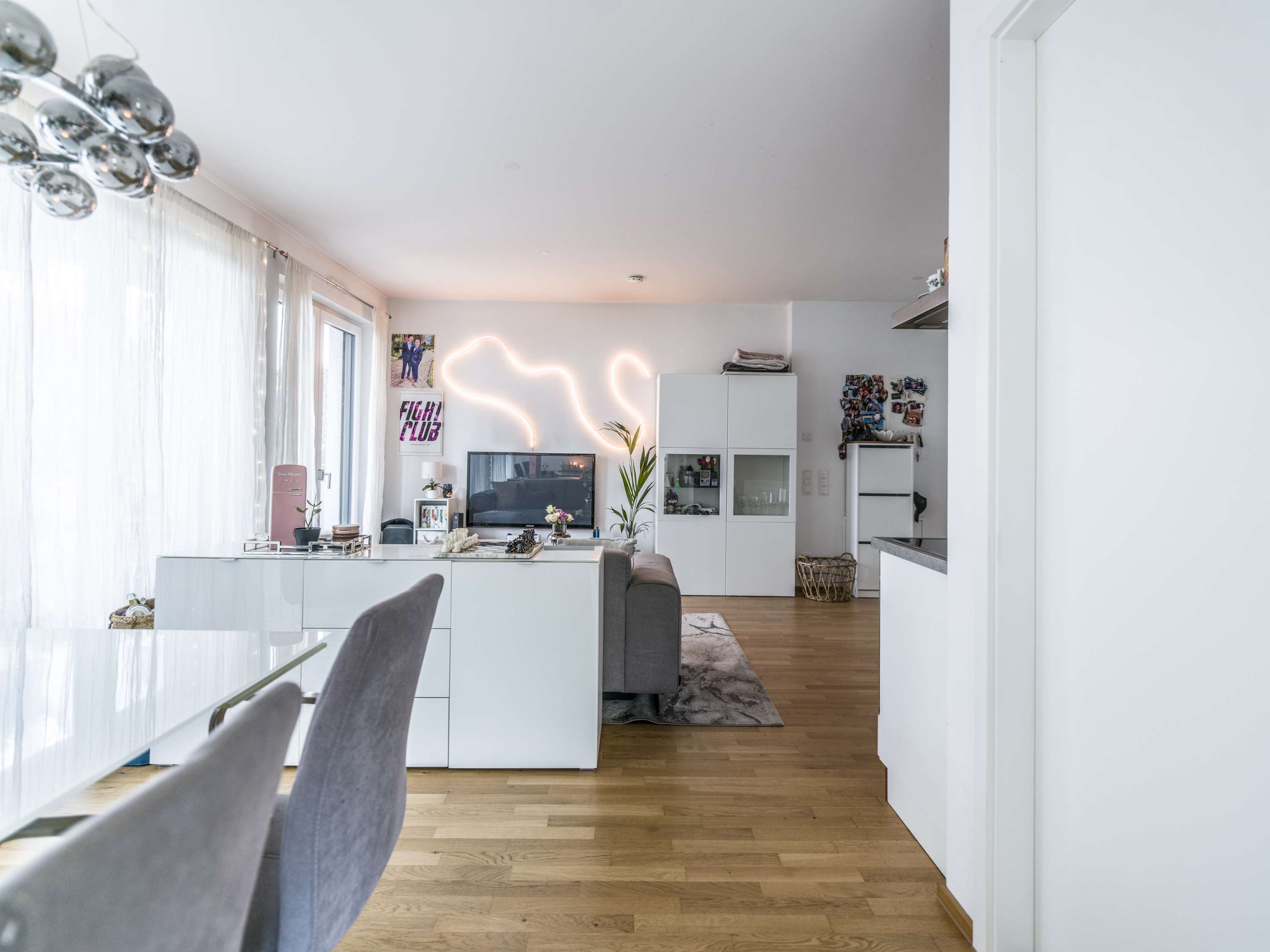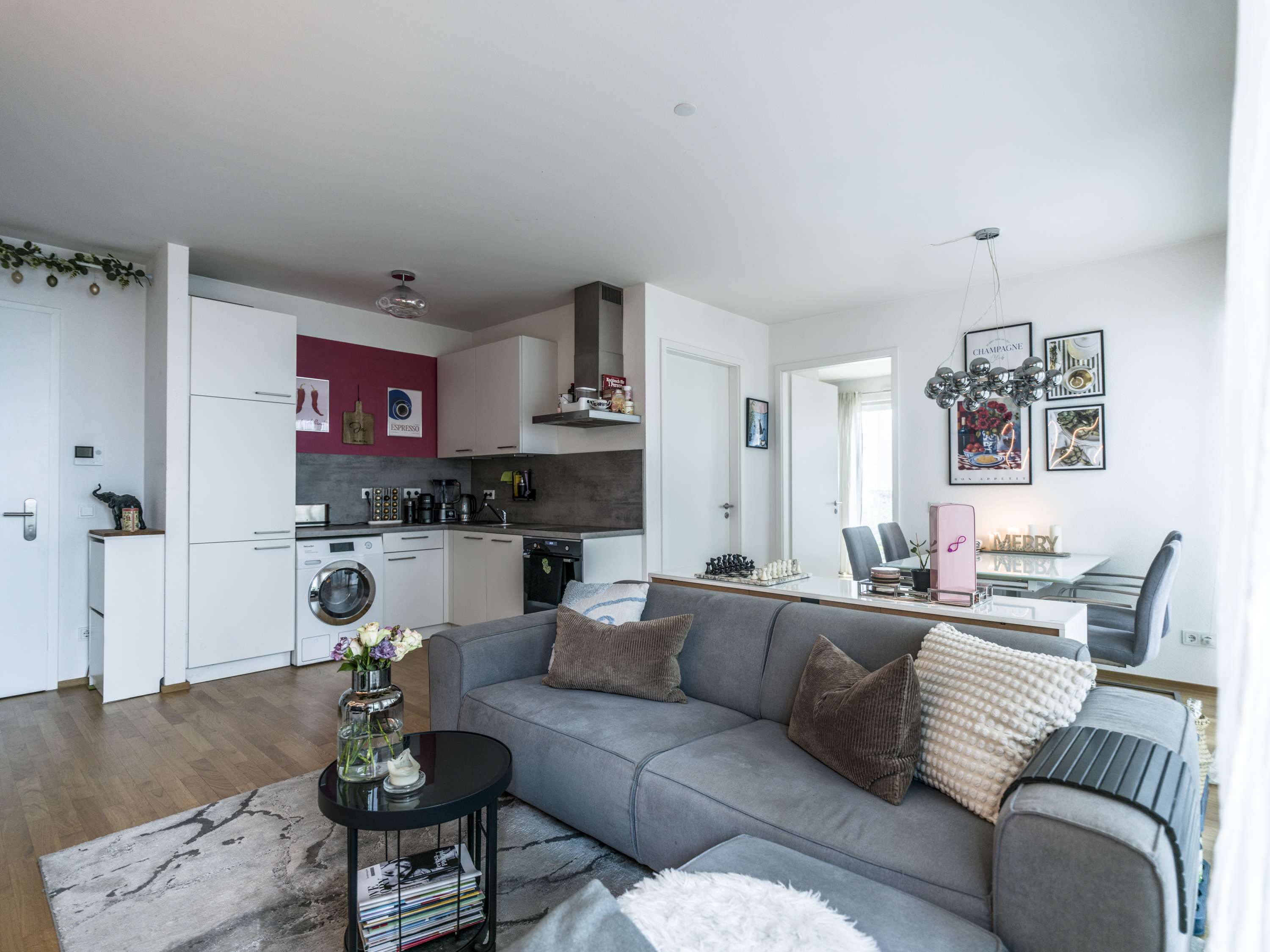 Der helle Wohn- und Essbereich wird durch bodentiefe Fenster mit viel Tageslicht verwöhnt und schafft eine freundliche, offene Atmosphäre. Von hier aus gelangen Sie direkt auf die Terrasse. Die vorhandene Einbauküche fügt sich harmonisch in das Wohnkonzept ein und bietet beste Voraussetzungen, um direkt einzuziehen und sich wohlzufühlen.