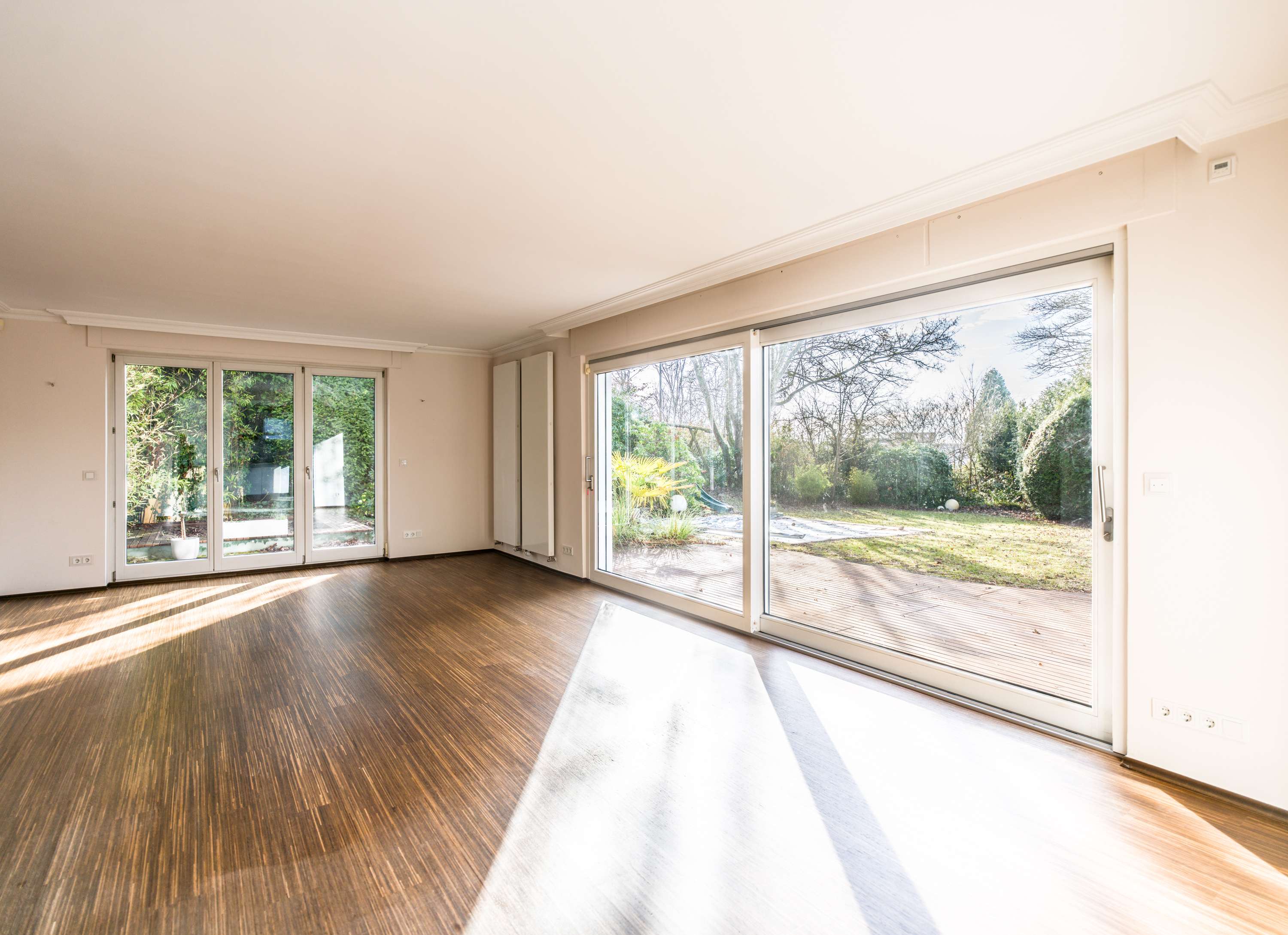 Der weitläufige Gartenbereich ist perfekt für Familie und Freunde, ideal für gesellige Grillabende oder ruhige Momente im Grünen. Der Außenbereich wurde mit viel Liebe zum Detail angelegt und bietet sowohl Schatten als auch Sonne, sodass der Garten zu jeder Jahreszeit in vollen Zügen genossen werden kann. Eine große Terrasse, die an das Wohnzimmer angrenzt, sorgt für einen direkten Zugang zur Natur und erweitert den Wohnraum nach draußen.