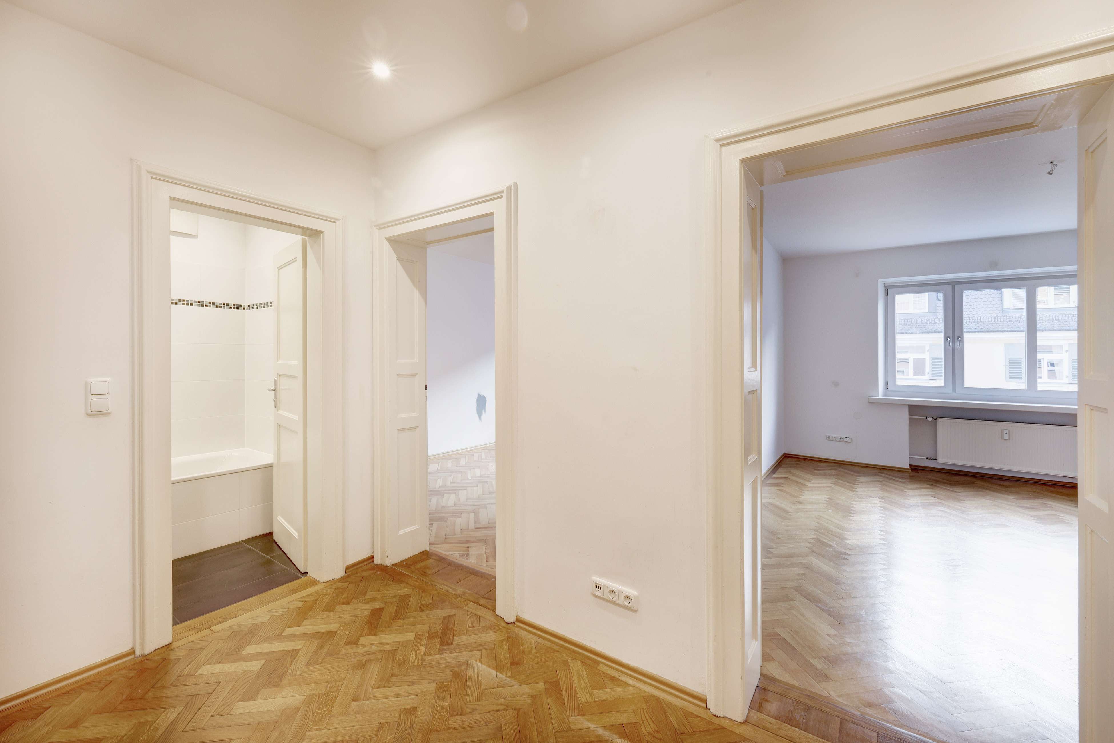 Die Wohnung befindet sich im ersten Stock und besticht durch ihren einzigartigen Charakter, der durch sorgfältig restaurierte Altbauelemente und die 2,80 m hohen Decken betont wird.